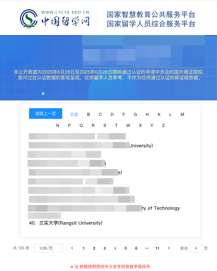 中国教育部留学服务中心(CSCSE,简称中留服)是中国教育部直属事业单位,负责对在境外取得的学位学历进行认证。中留服在其官网cscse.edu.cn公开了 2020-06-28 至 2025-06-28 期间通过认证的国外院校列表,泰国兰实大学(Rangsit University)位列第 40 位,与全球其他 104 所院校同时公示。